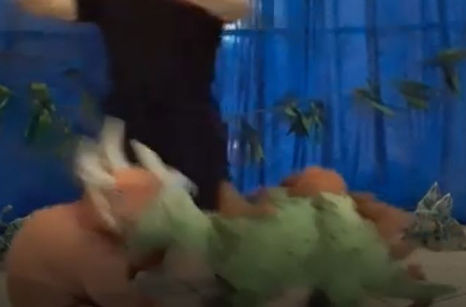 Ray the raptor shows off his juggling skills, but still needs more practice. Owen, our T-Rex host, keeps the jokes coming, like 'Why do carnivore dinosoars eat raw meat?'